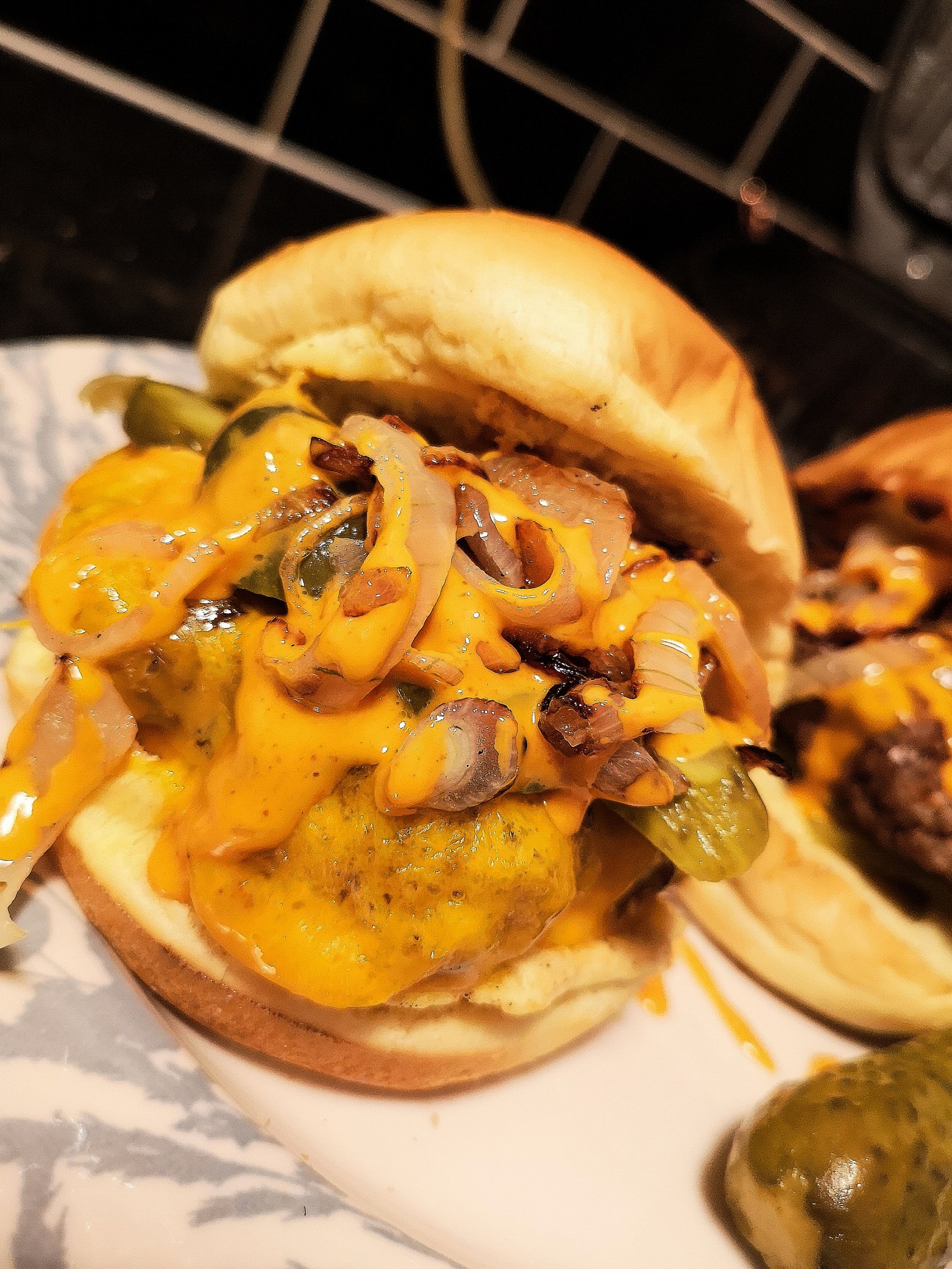 Pigeon Breast Burgers with Halloumi and Onion Chutney.
